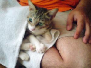 ちびっちょを膝に乗せながら、自分は雑誌を読んでいた。あぁ、良いねぇ。ネコを膝に乗せながら何かするのって…。実家のでかいネコだと結構辛いけどね(苦笑)