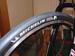 タイヤサイズは26×1.4とやや太いが、デザインがかなりイケイケな感じなので装着した。オートバイのスリックタイヤを彷彿とさせるデザインに、サイドの白いミシュランロゴが何とも攻撃的だ。