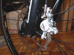 フロント周りはサスペンション付きに交換。傷んでいたホイールも最新式のチューブレス対応タイプにした。フォークとハブにはもちろんディスクブレーキの台座があるので、待望の油圧ディスクブレーキにした。