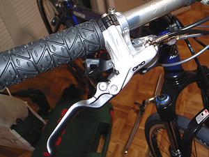 当然であるが、フロントレバーはこれまでの機械式から油圧ディスクブレーキに対応したマスターシリンダとなる。できるだけリアブレーキと形状が変わらないように注意したので、違和感はそれほど無い。