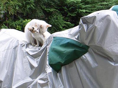最近バイクの上もネコの特等席になっている。白い仔猫もしくはその親猫が乗っているのだが、今日は両方とも乗っていた。
