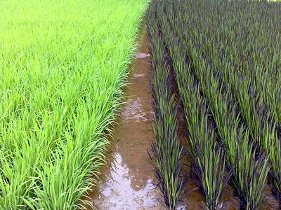 たまたま田んぼを見たら普通の稲に混ざって黒米を植えている田んぼがあった。