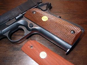いくら何でもこのオレンジ色はないんでないかい?ってことで、早速実銃用の木製グリップを入手。交換した。写真は交換後である。手前に移っているのがABS製のグリップだ。