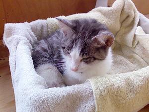 動物病院の配慮もあり、手術は当日の早い内に行われた。手術は無事に成功したのだが、弱っていたレオン君に全身麻酔はかなりの負担だったらしく、今朝までは生死をさ迷っていた。昨日、動物病院にお見舞いに行ったが、正直大丈夫かな…と思っていた。もちろん、仔猫の生命力を期待して応援していた。