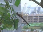 家庭菜園に水をやっていてふとトマトの熟れ具合を見ると、そこにトンボ(たぶんアキアカネ)がとまっていた。ちょいと嬉しかったのですぐにデジカメを持ってきて撮影。今日は天気も悪くて寒いのでさぞかしトンボもキツかろうと思う。あまり刺激しないようにそっとしておいた。