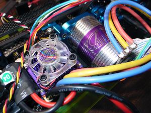 アンプはちょっと大きめだが、ブラシレス用ESCとしては標準サイズ。発熱量が多いので、ヒートシンクにクーリングファンが装着されている。何だかPC用の周辺機器だ(笑)