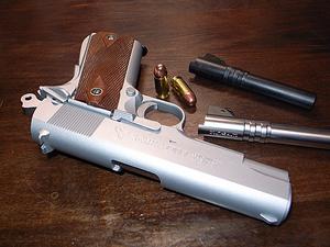 発火させるつもりは毛頭ないので、デトネータは取り払ってしまい、ダミーカート仕様へ変更した。このCommanderは、カートリッジは.45 ACPなので、当然カートリッジは大きく重い。7発フル装填(チャンバー内に入れれば8発)したら結構な重さになった。