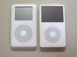 液晶ディスプレイが大型化されたのと、クリックホイールが小型化されたため、サイズがやたらと大きく見える。しかし、これまで使っていた20GBと並べてみると、60GBなのにサイズは同じか若干小さい。以前のモデルは角が丸いため、それほど大きく見えない工夫がなされていたのだ。