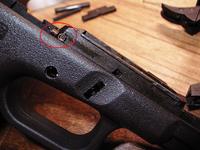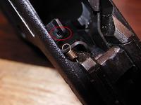 マガジンキャッチスプリングはフレームに刺さっているので簡単には外れないようになっている。無理にドライバーでこじって曲げないようにする。