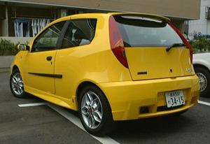 後ろから見るとマフラーエンドが見えない。これは最近環境対策のイメージで「いかにも」的なマフラーが後ろから見えるのを嫌っているためだそで。特にエグゼクティブなドイツ車によく見られる手法。PUNTOの場合はエンドで下側に向いていて見えないようになってます。