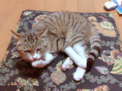 自分の隣にある暖かい座布団の上でゴロゴロ言いながら毛繕いをしているのだった。