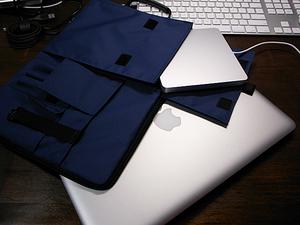 Apple Storeで見てみたが、イマイチパッとしないのでスルー。他に量販店でPC用のバッグもちょっと大げさすぎる。どうしようかなぁと思って見つけたのが上記インナーケースなのだ。価格も1500円くらいで手頃。ポケット類も使えそうなので気に入った。