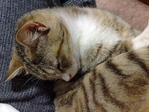 座っていると、ネズミのおもちゃで遊びまくっていた「ちびっちょ」さんが膝の上に乗って寝てしまう。