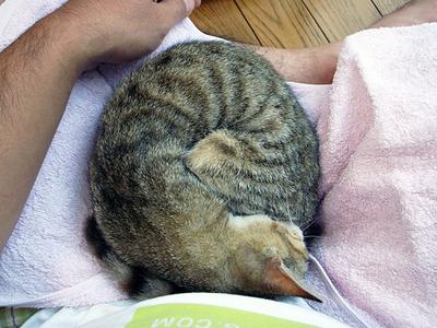 今朝、また窓際に行くと、足音で気がついたのか「ちびっちょ」が駆けてきた(かわいい)。そしてこれまた膝の上に乗りたがったので、こんどはタオルを引いてあげると、同じように体舐めをして寝てしまった。