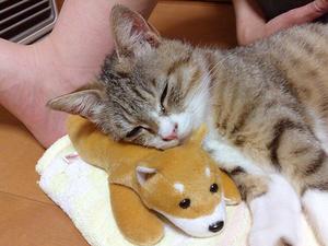 そんなちびこさんが眠そうだったので、ディスプレイクリーナー用のぬいぐるみを置くと、満足げに枕にして寝てしまった。