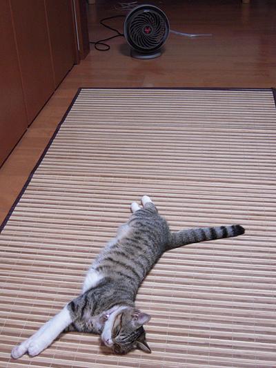 ウチでは扇風機やサーキュレータを使って室内の空気を循環させているのだが、ちびこさんはサーキュレータの前で伸びて寝てしまう。
