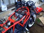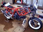 リア側はレーシングスタンド、フロントはクルマのジャッキでリフトアップする。タイヤやホイルの汚れがあまりに酷いので自由に回転しないのは面倒だから。もちろんカウル類は全て外し、ストリップにしてからネズミがかじり散らかしたケーブルのクズや糞、クモの巣などの汚れを落とす。