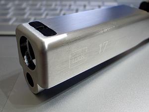 いまやろうとしているのは、グロック19で存在したポーテッドカスタム。前方にガスを抜く穴を開けて発射時の跳ね上がりを押さえるためのもの。もちろんエアガンではまったく意味無し(笑)